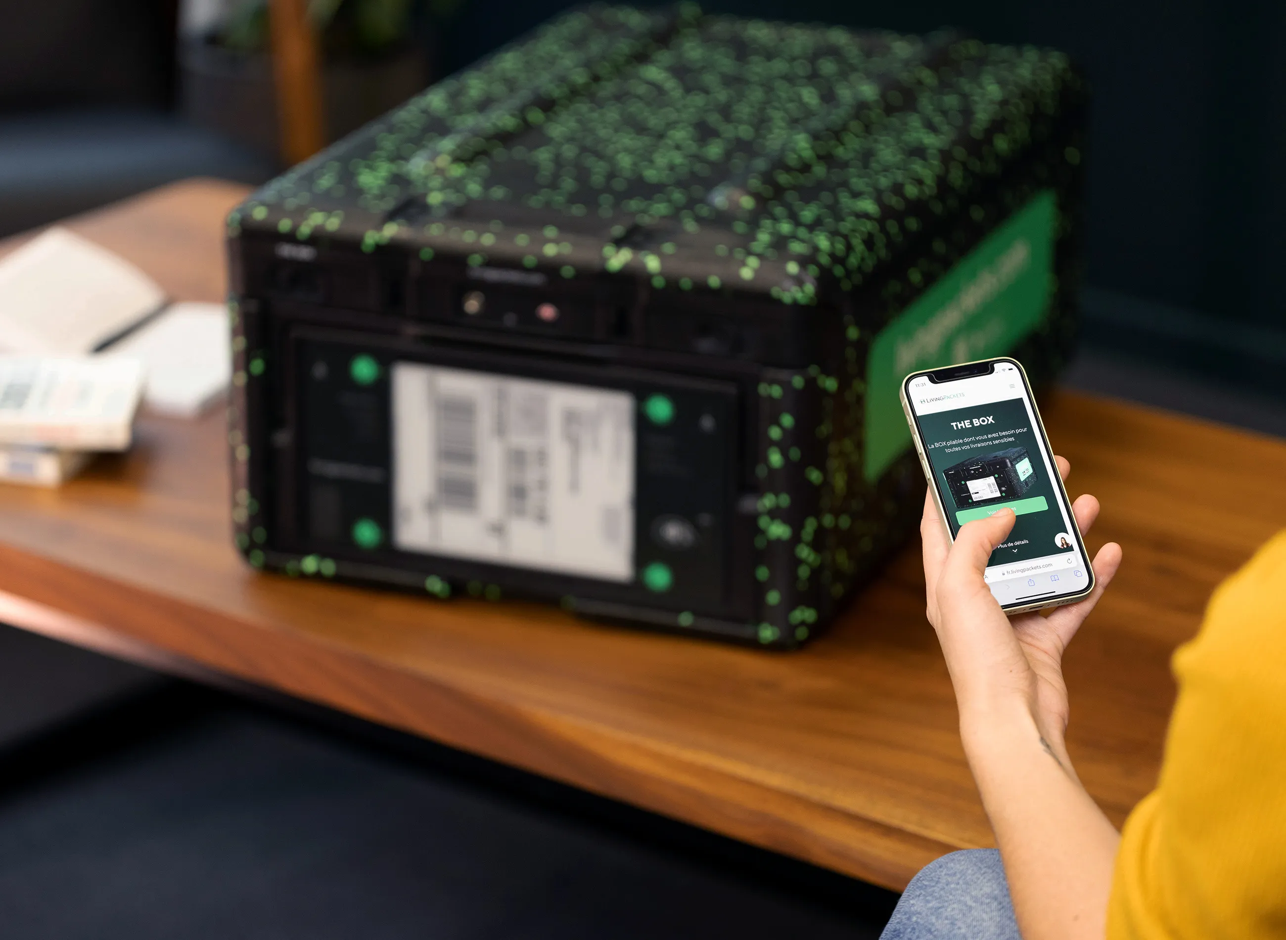 Place your item in THE BOX with custom-fit padding. Recipient data appears securely via the encrypted e-ink label.